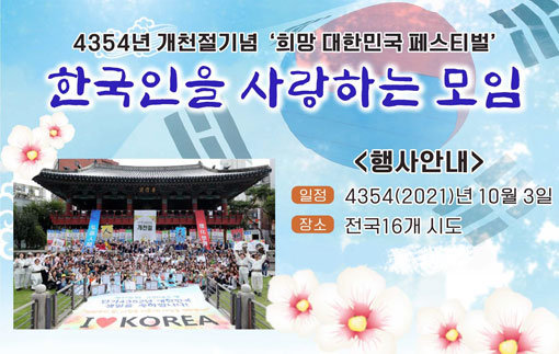 사단법인 국학원(원장 권나은)이 10월 3일 단기4354년 ‘대한민국의 생일’인 개천절을 맞아 전국적 행사를 마련했다.개천절의 의미 및 홍익인간과 한국인의 가치를 알리고자 전국 16개시도 지역국학원에서 대한민국을 사랑하는 시민과 함께 ‘희망! 대한민국 페스티벌’ 행사를 개최한다.