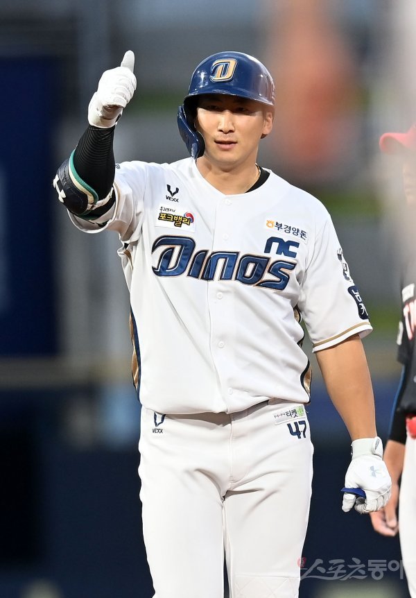 2회말 2사 2,3루 NC 나성범이 2타점 적시타를 치고 KIA 실책하는 사이 2루까지 진루한 후 엄지손가락을 들어보이고 있다.