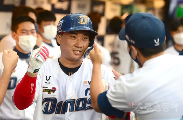 2회말 무사 NC 김태군이 좌월 솔로 홈런을 날리고 그라운드를 돌아 홈인해 하이파이브 하고 있다.