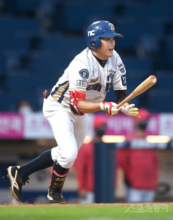 2회말 1사 2루 NC 최정원이 우전 안타를 치고 있다 .