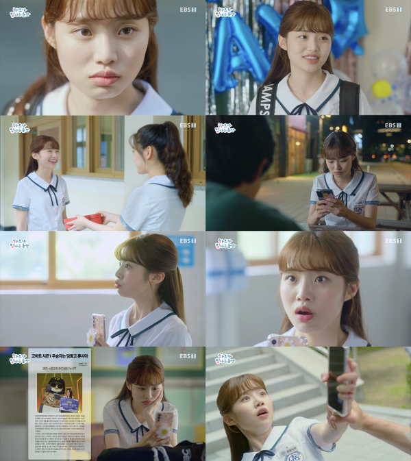 지난 28일 방송된 EBS 드라마 ‘하트가 빛나는 순간’ 1화에서는 해맑은 미소의 사랑스러운 고등학생 최빛나라(최지수)가 학교 최고의 인기남 서준영(오재웅)과 엮이며 벌어지는 파란만장 스토리가 그려졌다.