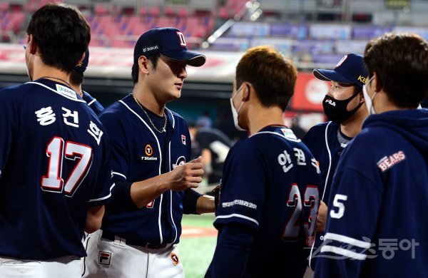5회까지 kt 공격을 1실점으로 막은 두산 선발 곽빈이 이닝 종료 후 동료들의 환영을 받고 있다.