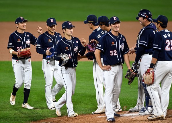 두산이 kt를 상대로 8-3으로 승리한 뒤 선수들이 그라운드에서 기쁨을 나누고 있다.