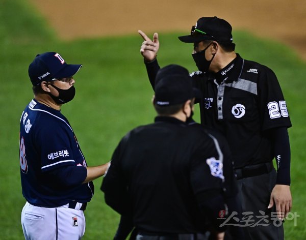 30일 서울 잠실야구장에서 열린 ‘2021 신한은행 SOL KBO리그’에서 LG 트윈스와 두산 베어스의 경기에서 5회말 1사 1, 2루 LG 2루주자 이영빈과 두산 포수 최용제의 충돌 과정 비디오 판독으로 판정이 뒤집히자 김태형 감독이 심판에게 어필하고 있다. 잠실 | 주현희 기자 teth1147@donga.com