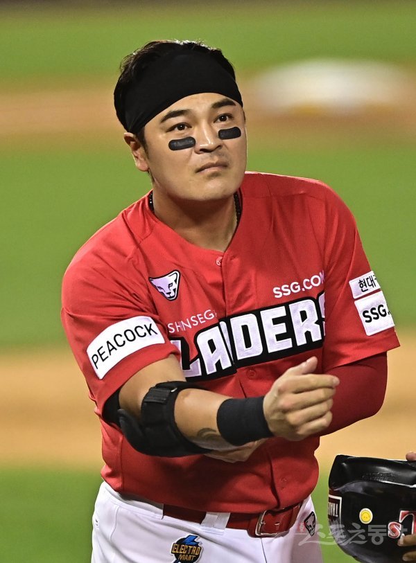 5일 서울 잠실야구장에서 열린 ‘2021 신한은행 SOL KBO리그’에서 LG 트윈스와 SSG 랜더스의 경기에서 2회말 2사 3루 SSG 추신수가 좌익수 뜬공으로 아웃된 뒤 보호 장비를 벗고 있다.