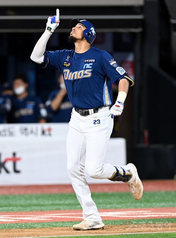 5회초 무사 2루에서 NC 알테어가 투런 홈런을 쏘아 올린 뒤 세리머니를 펼치고 있다.