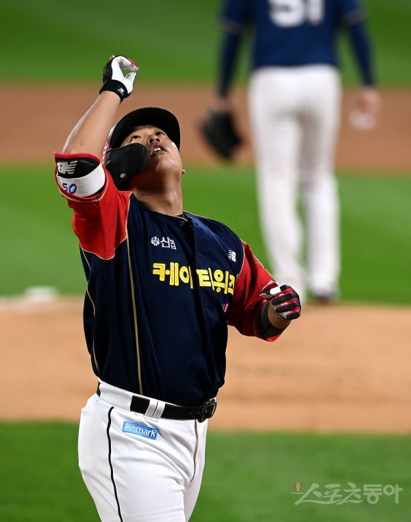1회말 2사에서 kt 강백호가 솔로 홈런을 쏘아 올린 뒤 그라운드를 돌며 세리머니를 펼치고 있다.