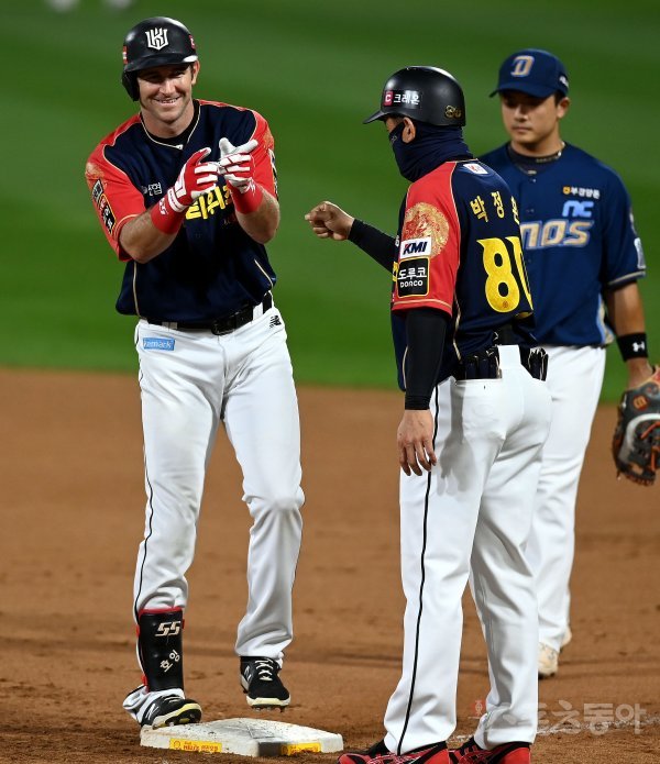 8회말 무사에서 kt 호잉이 안타를 날린 뒤 세리머니를 펼치고 있다.