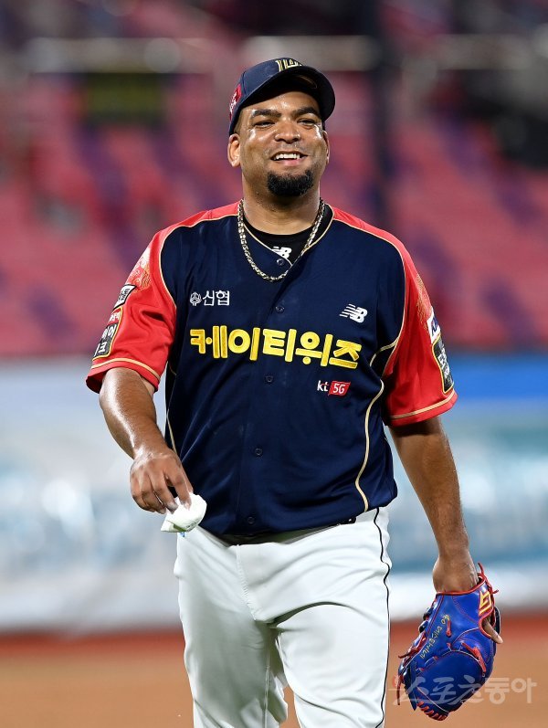 6회초 무사 2루 위기를 넘긴 kt 선발 데스파이네가 이닝 종료 후 미소를 지으며 더그아웃으로 향하고 있다.