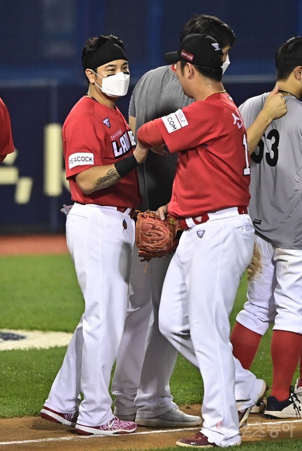 5일 서울 잠실야구장에서 열린 ‘2021 신한은행 SOL KBO리그’에서 LG 트윈스와 SSG 랜더스의 경기에서 SSG가 LG에 8-0으로 승리를 거둔 뒤 추신수가 동료들과 기쁨을 나누고 있다.