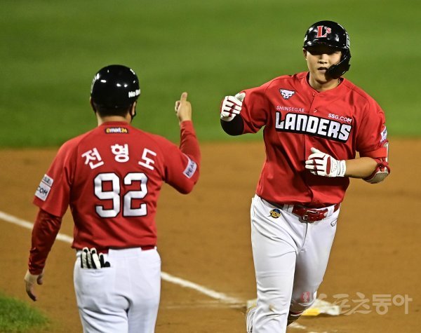 5일 서울 잠실야구장에서 열린 ‘2021 신한은행 SOL KBO리그’에서 LG 트윈스와 SSG 랜더스의 경기에서 9회초 무사 SSG 김찬형이 좌월 솔로 홈런을 쳐낸 뒤 3루코치와 기쁨을 나누고 있다.