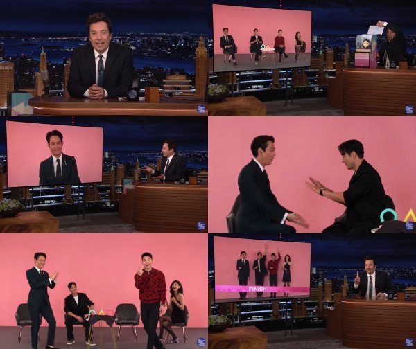 6일(현지시각) ‘오징어 게임’ 주연 배우 이정재, 박해수, 위하준, 정호연이 미국 NBC의 간판 토크쇼 ‘더 투나잇 쇼 스타링 지미 팰런’(The Tonight Show Starring Jimmy Fallon)에 출연했다. ‘더 투나잇 쇼'의 호스트 지미 팰런과 화상으로 첫 만남을 가진 ‘오징어 게임’ 배우들은 신드롬이라 해도 과언이 아닌 글로벌한 인기를 얻고 있는 것에 대한 각자의 소감과 ‘오징어 게임’ 공개 직전 태어나 ‘베이비 스퀴드’(Baby Squid)라는 귀여운 별명을 얻은 아이의 아빠가 된 박해수에 대한 축하 등으로 유쾌한 토크를 시작했다.
