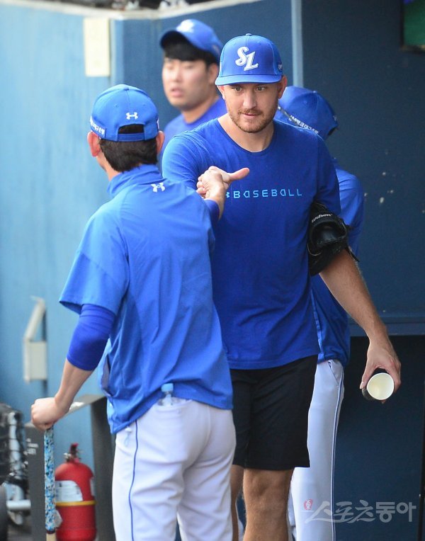 7일 창원NC파크에서 열린 ‘2021 신한은행 SOL KBO리그’에서 NC 다이노스와 삼성 라이온스의 경기에 앞서 삼성 몽고메리가 출장 정지 징계를 마친 뒤 더그아웃에서 코치와 인사를 하고 있다.