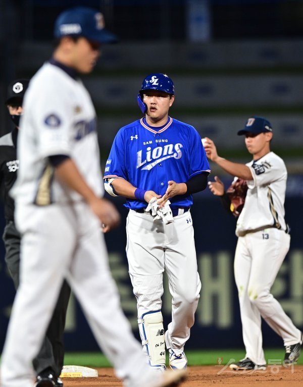 7일 창원NC파크에서 열린 ‘2021 신한은행 SOL KBO리그’에서 NC 다이노스와 삼성 라이온즈의 경기에서 5회초 2사 3루 삼성 오재일이 선제 1타점 중전 2루타를 쳐낸 뒤 보호 장비를 벗고 있다.