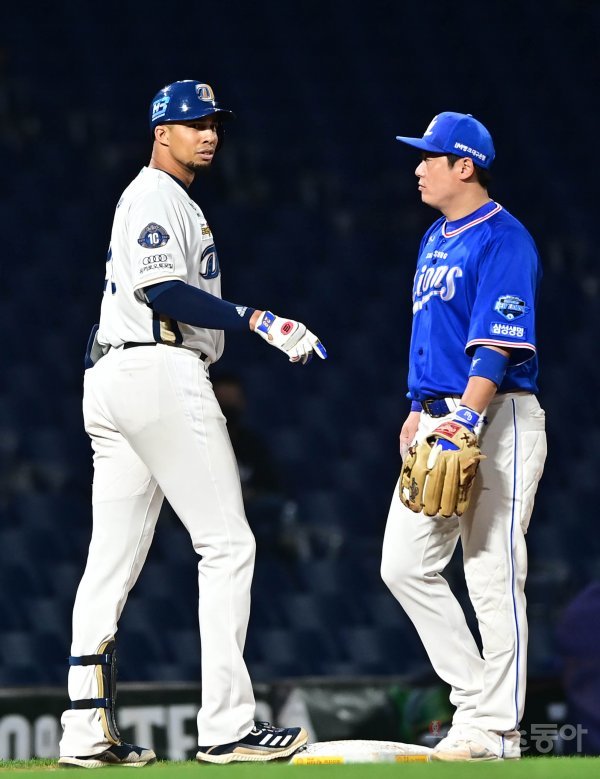 7일 창원NC파크에서 열린 ‘2021 신한은행 SOL KBO리그’에서 NC 다이노스와 삼성 라이온즈의 경기에서 5회말 무사 NC 알테어 좌전 3루타를 쳐낸 뒤 비디오 판독으로 홈런 여부를 기다리고 있다.