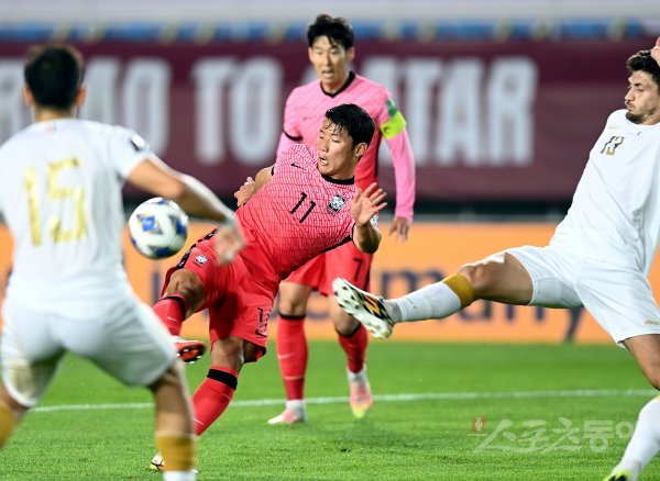 7일 경기도 안산 와스타디옴에서 ‘2022 카타르월드컵’ 아시아 최종예선 한국과 시리아의 경기에서 한국 황희찬이 시리아 수비수를 앞에 두고 슛을 날리고 있다. 안산 | 김민성 기자 marineboy@donga.com