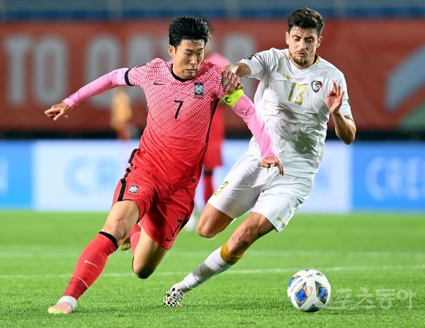 7일 경기도 안산 와스타디옴에서 ‘2022 카타르월드컵’ 아시아 최종예선 한국과 시리아의 경기에서 한국 손흥민이 시리아 수비를 제치며 돌파하고 있다. 안산 | 김민성 기자 marineboy@donga.com