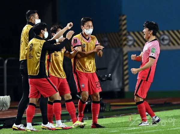 7일 경기도 안산 와스타디옴에서 ‘2022 카타르월드컵’ 아시아 최종예선 한국과 시리아의 경기에서 한국 황인범이 선제골을 넣은 뒤 환호하고 있다. 안산 | 김민성 기자 marineboy@donga.com