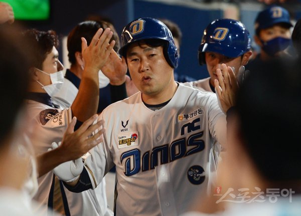 7일 창원NC파크에서 열린 ‘2021 신한은행 SOL KBO리그’에서 NC 다이노스와 삼성 라이온즈의 경기에서 8회말 2사 3루 NC 양의지가 좌월 2점 홈런을 쳐낸 뒤 더그아웃에서 동료들의 축하를 받고 있다. 창원 | 주현희 기자 teth1147@donga.com