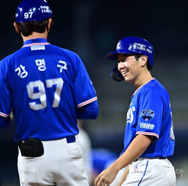 7일 창원NC파크에서 열린 ‘2021 신한은행 SOL KBO리그’에서 NC 다이노스와 삼성 라이온즈의 경기에서 9회초 2사 만루 삼성 김지찬이 역전 2타점 좌전 적시타를 쳐낸 뒤 기뻐하고 있다. 창원 | 주현희 기자 teth1147@donga.com