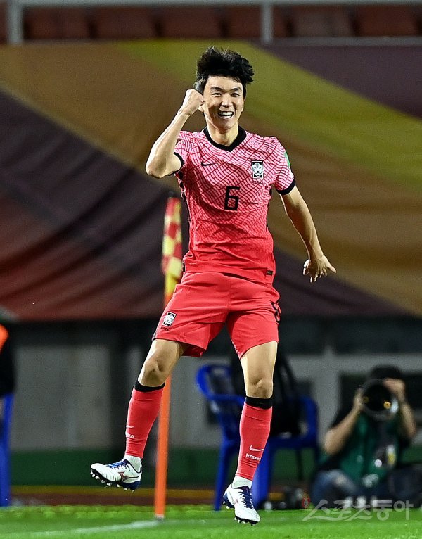 7일 경기도 안산 와스타디옴에서 ‘2022 카타르월드컵’ 아시아 최종예선 한국과 시리아의 경기에서 한국 황인범이 선제골을 넣은 뒤 환호하고 있다. 안산 | 김민성 기자 marineboy@donga.com