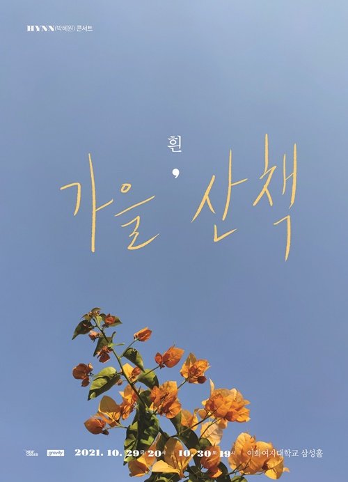 서울 서대문구에 위치한 이화여자대학교 삼성홀에서 개최되는 ‘흰, 가을 산책’에서는 HYNN(박혜원)의 대표곡들은 물론 관객과 공감할 수 있는 감성의 커버 무대들로 채워질 예정이다. 무엇보다 매번 공연을 통해 성숙해진 감성과 무대 매너를 보여주고 있는 HYNN(박혜원)의 성장을 확인할 수 있는 기회가 전망이다.