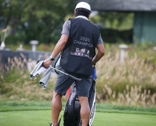 제네시스 챔피언십은 국내 골프 대회 사상 최초로 캐디빕에 캐디의 이름을 선수 이름과 나란히 표기했다. 대회 구성원에 대한 주최사의 세심한 배려가 돋보인다. 김태훈의 캐디를 맡고 있는 아버지 김형돈 씨가 아들의 이름과 자신의 이름이 나란히 적힌 캐디빕을 착용한 뒷모습. 사진제공 | KPGA
