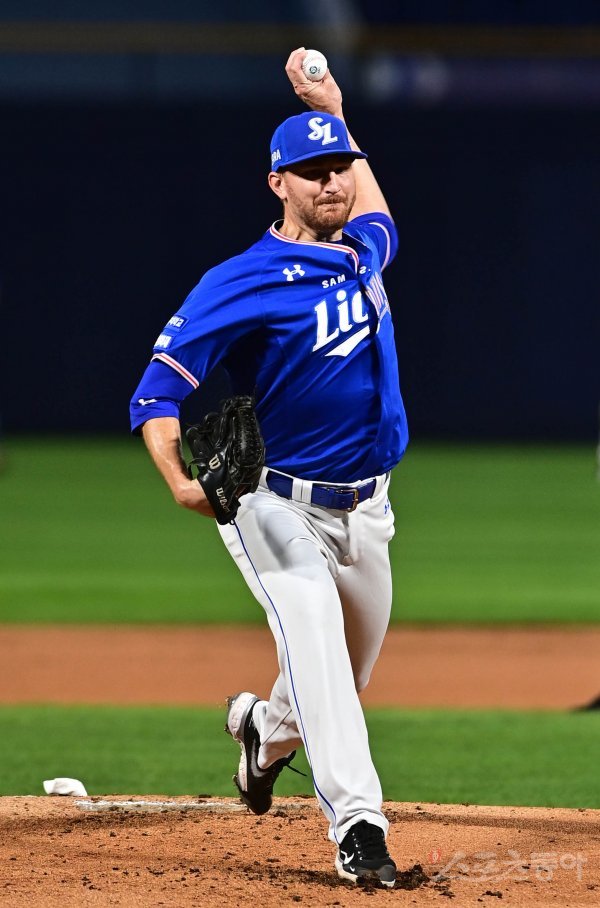 8일 창원NC파크에서 열린 ‘2021 신한은행 SOL KBO리그’에서 NC 다이노스와 삼성 라이온즈의 경기에서 선발 투수로 마운드에 오른 삼성 몽고메리가 역투하고 있다.