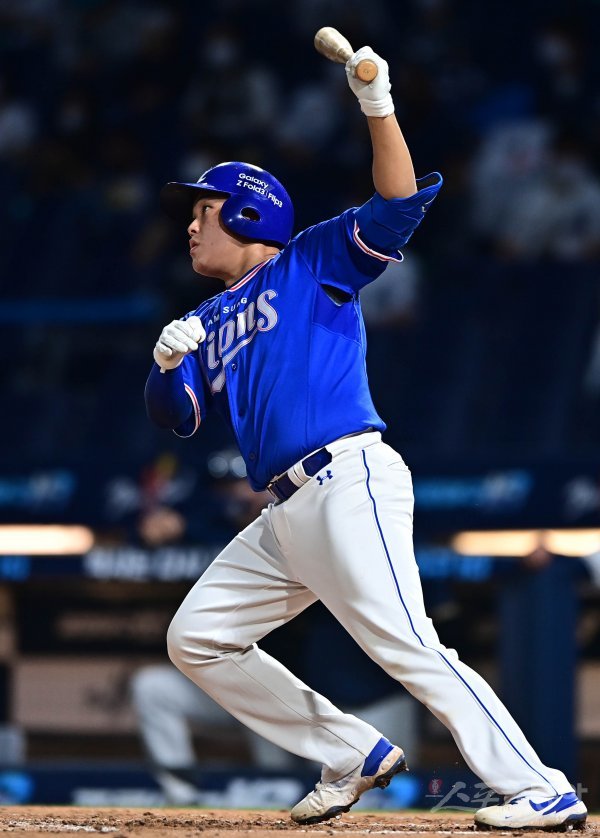 8일 창원NC파크에서 열린 ‘2021 신한은행 SOL KBO리그’에서 NC 다이노스와 삼성 라이온즈의 경기에서 3회초 2사 삼성 김도환이 중전 2루타를 치고 있다.