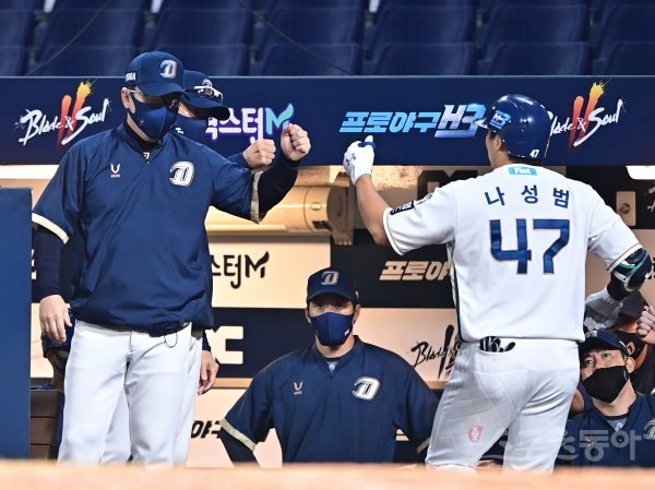 8일 창원NC파크에서 열린 ‘2021 신한은행 SOL KBO리그’에서 NC 다이노스와 삼성 라이온즈의 경기에서 3회말 무사 NC 나성범이 우월 솔로 홈런을 쳐낸 뒤 더그아웃에서 이동욱 감독의 축하를 받고 있다.