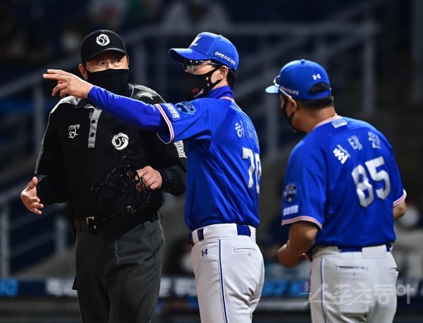 8일 창원NC파크에서 열린 ‘2021 신한은행 SOL KBO리그’에서 NC 다이노스와 삼성 라이온즈의 경기에서 8회초 1사 2루 삼성 박해민의 뜬공이 NC 좌익수 정진기에게 잡히자 허삼영 감독이 비디오 판독을 요청하고 있다.