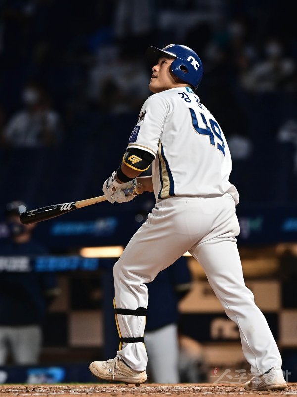 8일 창원NC파크에서 열린 ‘2021 신한은행 SOL KBO리그’에서 NC 다이노스와 삼성 라이온즈의 경기에서 8회말 1사 NC 강진성이 좌월 솔로 홈런을 치고 있다.