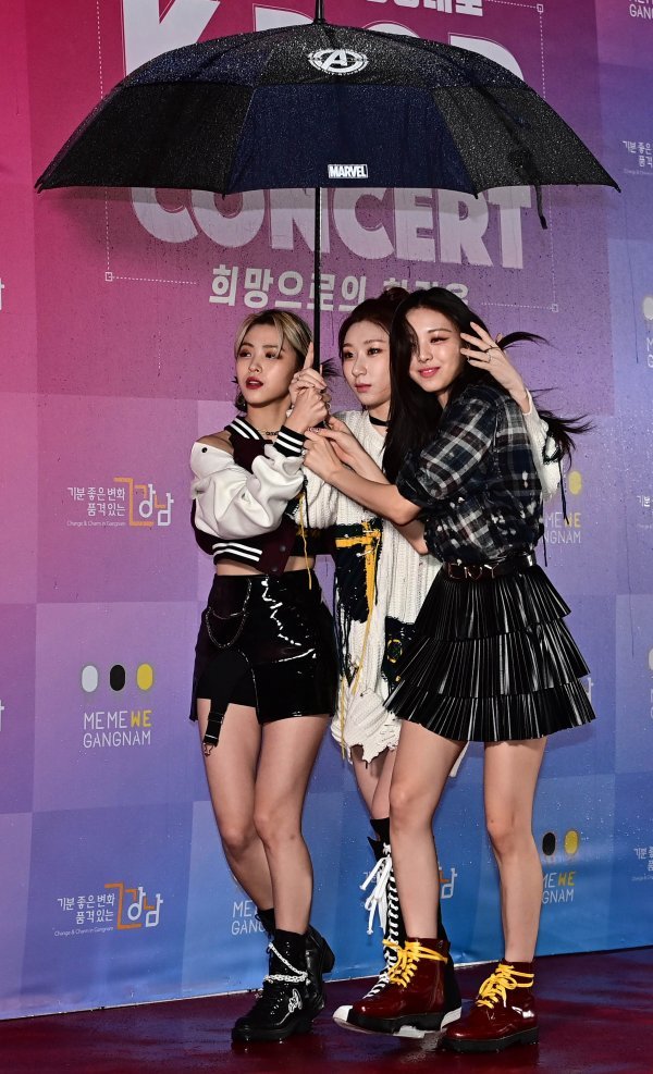 10일 서울 강남구 삼성동 코엑스에서 열린 ‘온택트 2021 강남페스티벌’ 영동대로 K-POP 콘서트에서 그룹 ITZY 류진, 채령, 유나가 우산을 쓴 채 포토월을 나서고 있다.