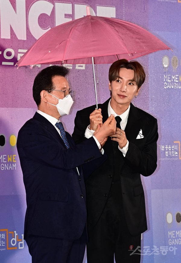10일 서울 강남구 삼성동 코엑스에서 열린 ‘온택트 2021 강남페스티벌’ 영동대로 K-POP 콘서트 포토월에서 가수 이특과 정순균 강남구청장과 기념 촬영을 하고 있다.