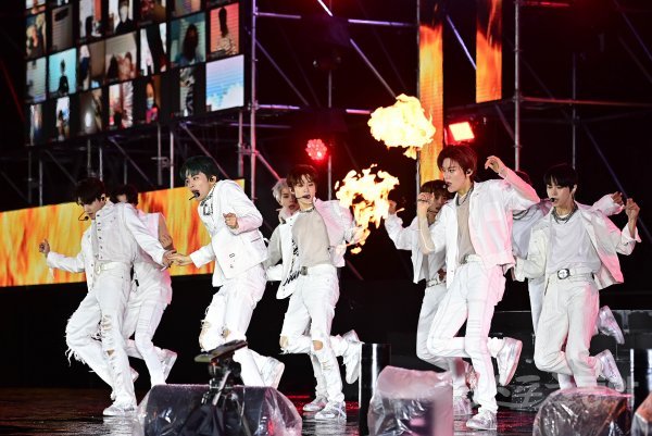 그룹 NCT127이 10일 서울 강남구 삼성동 코엑스에서 열린 ‘온택트 2021 강남페스티벌’ 영동대로 K-POP 콘서트에서 무대를 펼치고 있다.