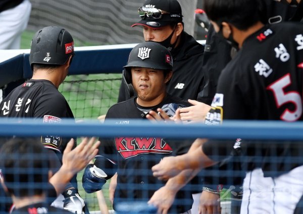 11일 서울 잠실야구장에서 ‘2021 신한은행 SOL KBO리그’ LG 트윈스와 kt 위즈의 경기가 열렸다. 1회초 무사 만루에서 kt 3루 주자 조용호가 밀어내기 볼넷으로 득점에 성공한 뒤 동료들의 환영을 받고 있다.