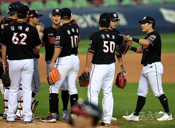 11일 서울 잠실야구장에서 ‘2021 신한은행 SOL KBO리그’ LG 트윈스와 kt 위즈의 경기가 열렸다. kt가 LG를 상대로 4-2로 승리한 뒤 선수들이 그라운드에서 기쁨을 나누고 있다.