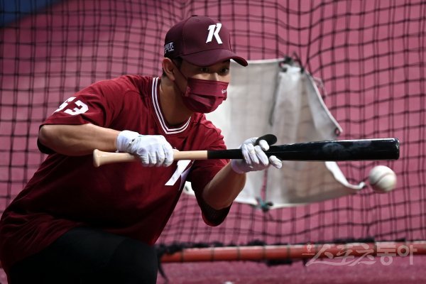 12일 서울 고척스카이돔에서 ‘2021 신한은행 SOL KBO리그’ 키움 히어로즈와 NC 다이노스의 경기가 열린다. 경기에 앞서 키움 예진원이 번트 훈련을 하고 있다.