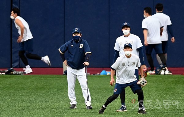 12일 서울 고척스카이돔에서 ‘2021 신한은행 SOL KBO리그’ 키움 히어로즈와 NC 다이노스의 경기가 열린다. 경기에 앞서 NC 이동욱 감독이 외야수들의 훈련을 지켜보고 있다.