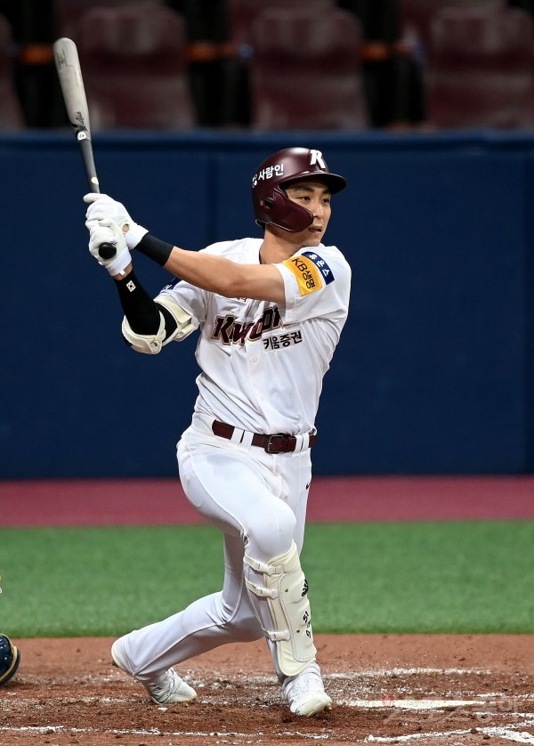 12일 서울 고척스카이돔에서 ‘2021 신한은행 SOL KBO리그’ 키움 히어로즈와 NC 다이노스의 경기가 열렸다. 3회말 1사 1, 2루에서 키움 이정후가 1타점 동점 적시타를 날리고 있다.