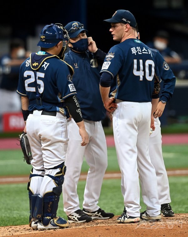 12일 서울 고척스카이돔에서 ‘2021 신한은행 SOL KBO리그’ 키움 히어로즈와 NC 다이노스의 경기가 열렸다. 4회말 2사 1, 2루에서 NC 선발 루친스키가 마운드에 오른 이동욱 감독과 이야기를 나누고 있다.