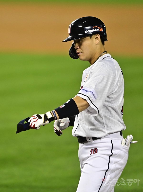 12일 서울 잠실야구장에서 열린 ‘2021 신한은행 SOL KBO리그’에서 두산 베어스와 KT 위즈의 경기에서 3회말 1사 2루 두산 박세혁이 선제 1타점 중전 적시타를 쳐낸 뒤 세리머니를 하고 있다.