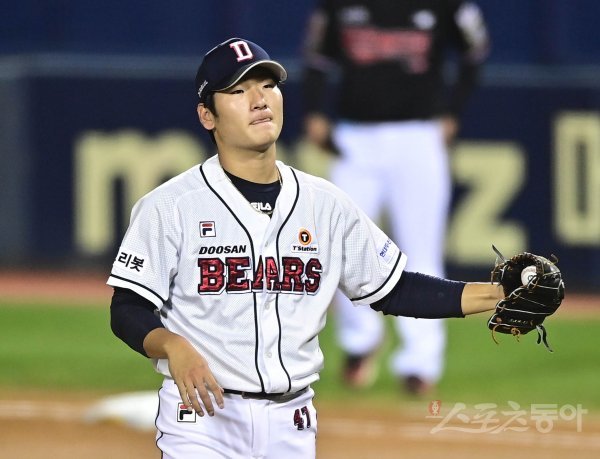 12일 서울 잠실야구장에서 열린 ‘2021 신한은행 SOL KBO리그’에서 두산 베어스와 KT 위즈의 경기에서 1회초 무사 1, 2루 상황에서 두산 곽빈이 KT에 세 타자 연속 볼넷을 허용한 뒤 아쉬워하고 있다.