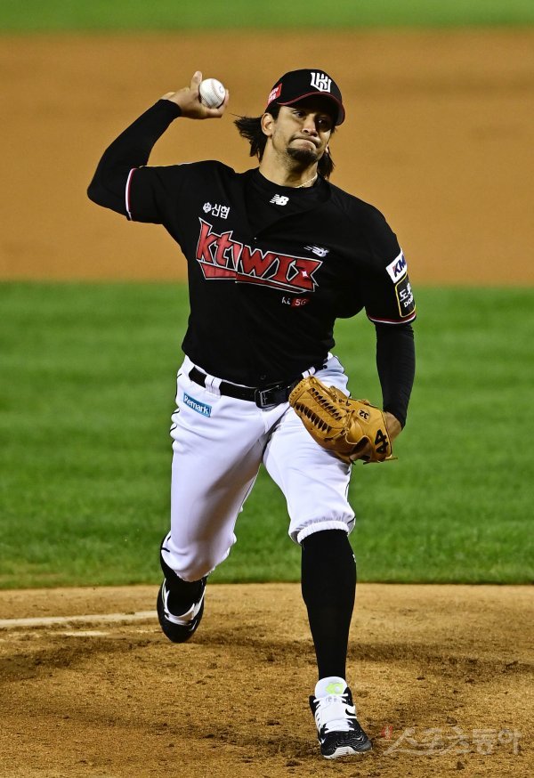 12일 서울 잠실야구장에서 열린 ‘2021 신한은행 SOL KBO리그’에서 두산 베어스와 KT 위즈의 경기에서 선발 투수로 마운드에 오른 KT 쿠에바스가 역투하고 있다.