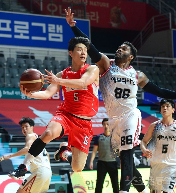 12일 고양체육관에서 열린 ‘2021-2022 KGC인삼공사 정관장 프로농구’ 고양 오리온과 안양 KGC 경기에서 오리온 한호빈이 KGC 먼로의 수비를 뚫고 골밑을 공격하고 있다.