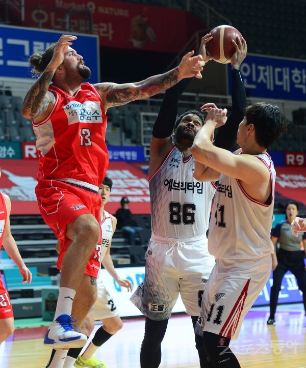 12일 고양체육관에서 열린 ‘2021-2022 KGC인삼공사 정관장 프로농구’ 고양 오리온과 안양 KGC 경기에서 오리온 라둘리차와 KGC 먼로가 리바운드 볼을 다투고 있다.