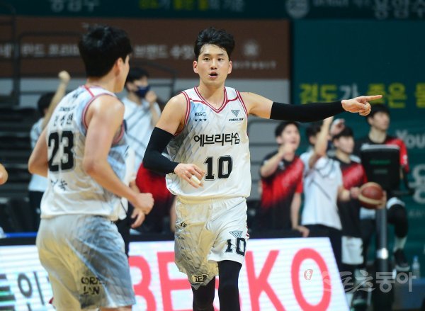 12일 고양체육관에서 열린 ‘2021-2022 KGC인삼공사 정관장 프로농구’ 고양 오리온과 안양 KGC 경기에서 KGC 문성곤이 3점슛을 성공시킨 후 환호하고 있다.
