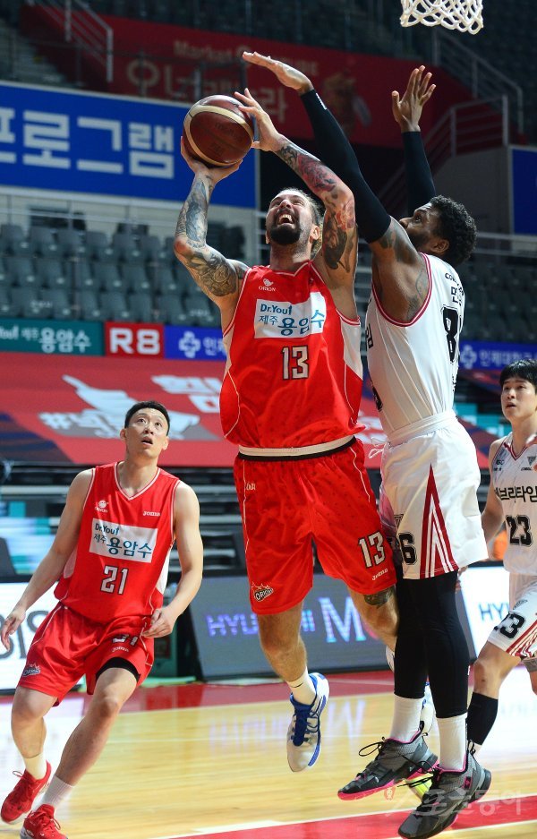12일 고양체육관에서 열린 ‘2021-2022 KGC인삼공사 정관장 프로농구’ 고양 오리온과 안양 KGC 경기에서 오리온 라둘리차가 KGC의 수비를 뚫고 골밑 슛을 하고 있다.