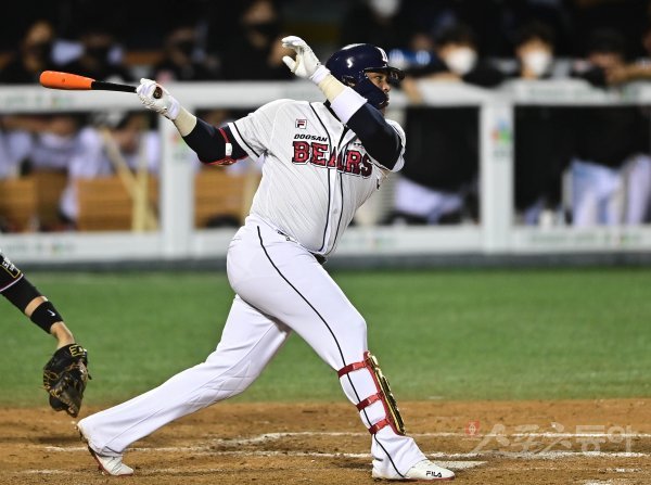 12일 서울 잠실야구장에서 열린 ‘2021 신한은행 SOL KBO리그’에서 두산 베어스와 KT 위즈의 경기에서 7회말 무사 2루 두산 페르난데스 1타점 중전 적시타를 치고 있다.