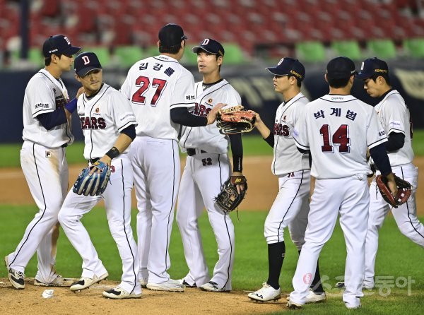12일 서울 잠실야구장에서 열린 ‘2021 신한은행 SOL KBO리그’에서 두산 베어스와 KT 위즈의 경기에서 두산이 KT에 4-1로 승리를 거둔 뒤 선수들이 기쁨을 나누고 있다. 잠실 | 주현희 기자 teth1147@donga.com